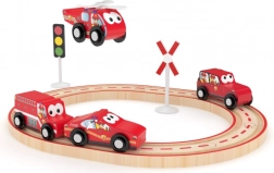 A csomag 16 elemet tartalmaz, köztük fa síneket és tűzoltós motívumú járműveket. A gyerekek saját pályákat építhetnek, és történeteket alkothatnak, amelyek fejlesztik fantáziájukat és szociális készségeiket.
