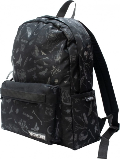 Stílusos hátizsák, amelyet a WEDNESDAY esztétikája inspirált, minőségi poliészterből, ideális mindennapi használatra. Könnyű kialakítást, tartósságot és egyszerű karbantartást kínál. Univerzális dizájnjának köszönhetően remek választás iskolába, munkába és szabadidőre is. Könnyű, tartós és könnyen tisztítható anyaga hosszú élettartamot és kényelmes viselést biztosít.