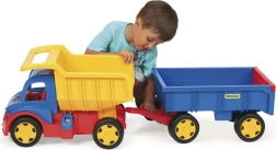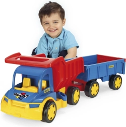 Ez az óriási teherautó pótkocsival ideális minden kis teherautó-szerető számára. Nagy és masszív felépítése tartósságot és szórakozást biztosít hosszú évekig. A csatlakoztatható vonórúd révén a gyerekek könnyen húzhatják az autót, és használhatják játékok vagy más tárgyak szállítására. Szórakozás és tanulás egyben; a teherautó serkenti a gyerekek képzelőerejét, javítja a kézügyességet és támogatja a szem-kéz koordinációt. Kiválóan alkalmas otthoni és szabadtéri játékra is.