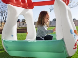 A Gombasátor felfújható házikó tartós PVC-ből készült, amely biztosítja a stabilitást és a biztonságot. A puha felfújt falak védik a gyermeket a sérülésektől, és a széles alap megakadályozza a házikó felborulását. Kompakt méreteinek köszönhetően könnyen elhelyezhető otthon vagy szabadtéren, ami ideális játszóhelyet teremt.