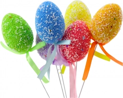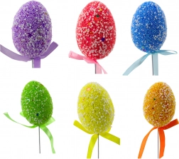 Színes húsvéti beszúró tojások stílusos masnival szépen kiegészítik az asztal, a virágcserepek és az egyéb kompozíciók tavaszi díszítését. A könnyű habtojások gyöngyszerű, struktúrált felülettel és finom mintákkal friss, játékos hatást keltenek, míg a rugalmas drót megkönnyíti az elhelyezést a dekorációkban.