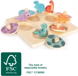 Fedezze fel a szórakoztató és oktató jellegű fa memóriafejlesztő dinoszaurusz puzzle-t 100% FSC tanúsítvánnyal rendelkező fából. A készlet beszúró játékot és memóriajátékot egyesít: a színes dínótojások alá az odaillő dinoszaurusz figurák kerülnek. A fa fogantyúknak köszönhetően a darabok a legkisebbek számára is könnyen megfoghatók, a játék pedig természetes módon fejleszti a finommotorikát, a kéz–szem koordinációt, a türelmet, a koncentrációt, valamint a színek és formák érzékelését.