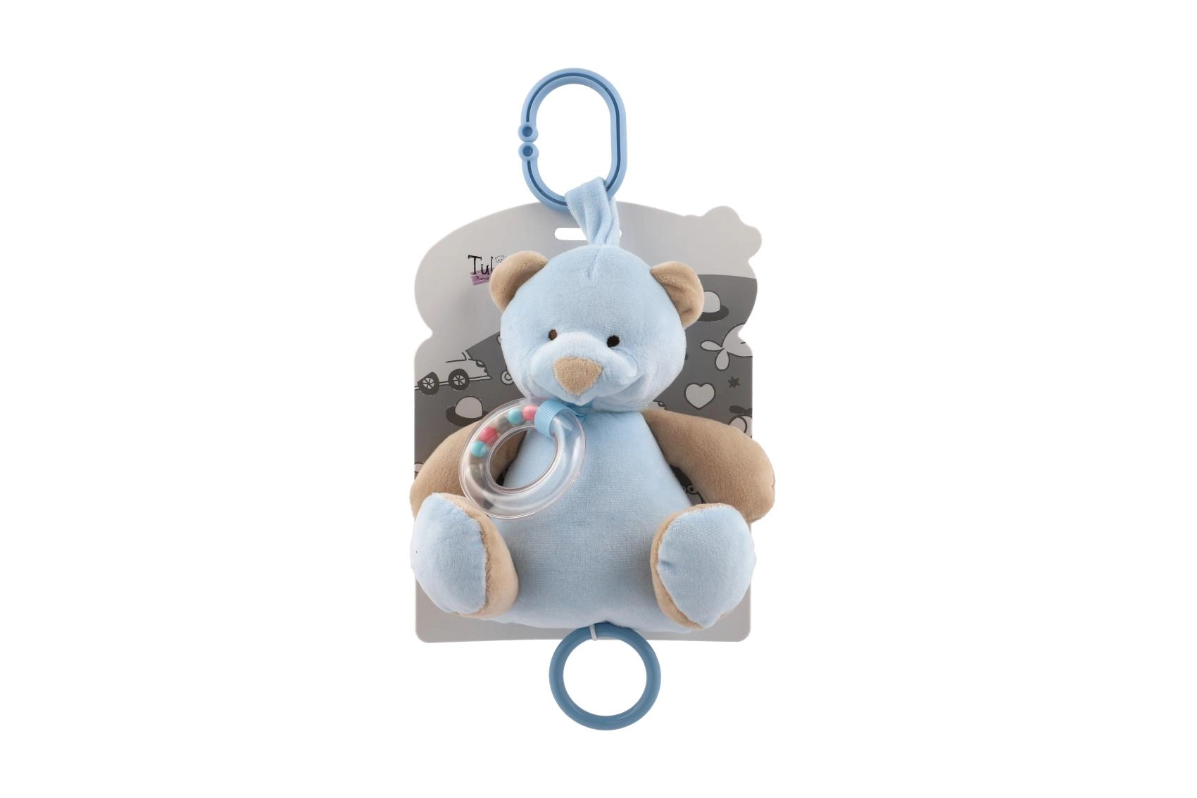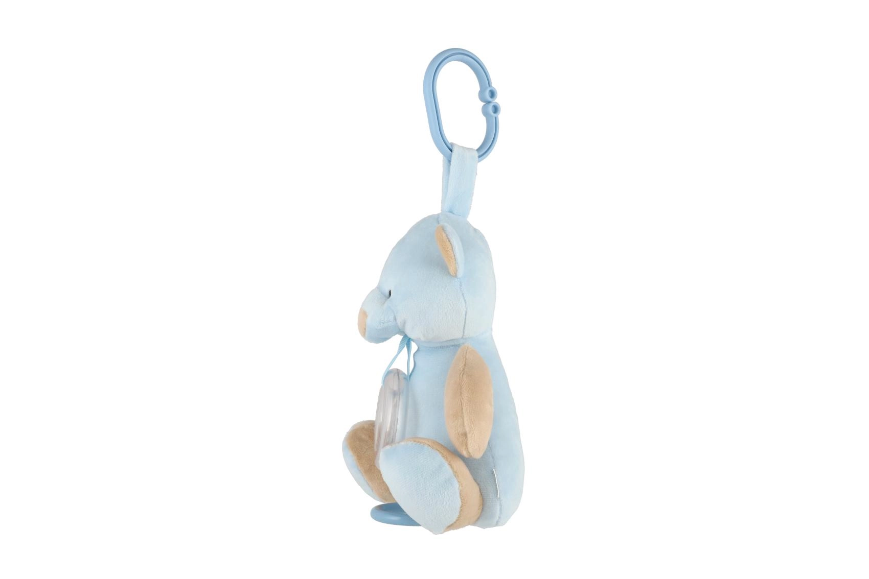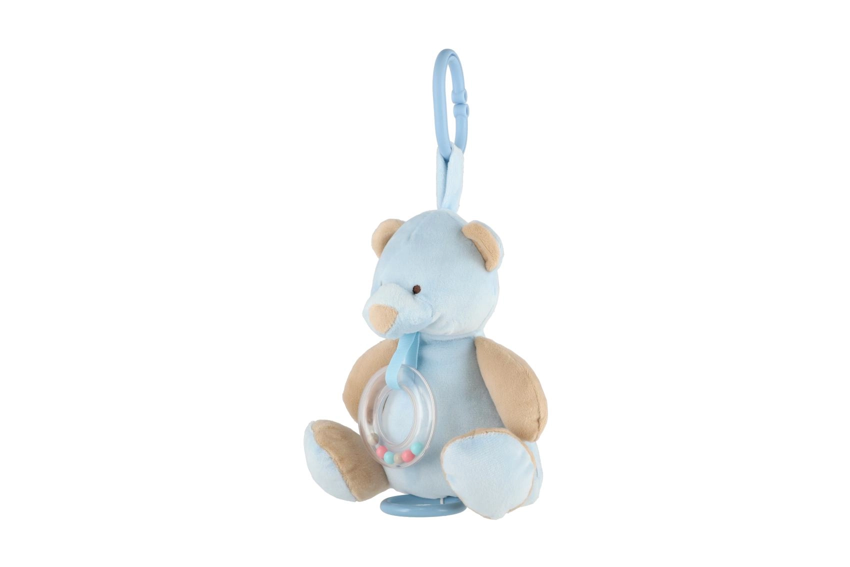 A bájos kék maci zenélő/csörgő elemmel és akasztóklippel otthon és útközben is megnyugtatja a babát. Pihe-puha, gyermekbiztonságos, és finom színei bármely babakelengyéhez illenek. Az átlátszó gyűrűben lévő gyöngyök hangingerlést biztosítanak, a klip könnyű rögzítést tesz lehetővé babakocsira vagy autósülésre, a kellemes plüss pedig segíti az elalvást.