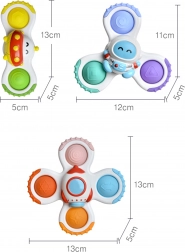 A Woopie gyerek pörgettyű készlet űrtémát kínál rakéta, űrlény és UFO motívumokkal. Ezek a műanyag játékok ideálisak a különböző környezetekben való játékhoz. A pörgettyű gumi elemekkel rendelkezik, amelyek serkentik az érzékelés fejlődését. A tapadókorongoknak köszönhetően a játékok könnyen rögzíthetők különböző felületeken, ami ideális utazás közben vagy fürdéskor a kádban. A csapágyak rugalmassága zökkenőmentes és tartós mozgást biztosít.