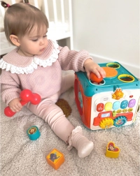 Minden tevékenység gondosan megtervezett, hogy támogassa a különböző készségeket, mint a kéz-szem koordináció, forma- és színfelismerés, a hallás fejlesztése és a kreativitás kifejezése. Kompakt méretének köszönhetően a kocka könnyen hordozható, mégis tele van soha véget nem érő szórakozással a kis felfedezők számára, akik játék közben szeretnének tanulni.