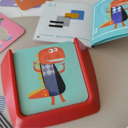 A szett része egy stabil állvány, négy figura-sablon és színes válogatás mintakártyákból, valamint feladat- és megoldásfüzet. A játék szépen fejleszti a térbeli észlelést, a finommotorikát és a vizuális percepciót alakok, színek és minták terén. Remek oktató ajándék óvodásoknak.