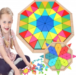 A nagy háromszögkészlet lehetővé teszi egyszerű alakzatok és összetett mandalák, minták kirakását – remek szórakozás hosszú órákon át.