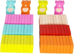 Ez a színes fa dominó készlet hosszú órákra nyújt szórakozást a gyerekeknek. Találsz benne téglalap alakú köveket, medve figurákat, hengereket, kockákat, golyókat, kapukat csengővel és keresztrúddal, valamint egy textil zsákot. A természetes fa és a hat élénk szín kombinációja inspirálja a fantáziát, a pályaépítést és a színes szekvenciákat.