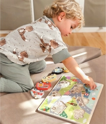 Ez a fa Montessori beillesztő játékos formában kínál szórakoztató tanulást. A készlet egy masszív tábla kivágásokkal és 7 járműelemmel (pl. autó, taxi, rendőrség, mentő, tűzoltó, repülő, hajó) áll, amelyeket a gyerekek alak és kép alapján párosítanak. A világos színeknek és az áttekinthető körvonalaknak köszönhetően a gyerekek gyorsan megértik a párosítás elvét, és minden helyesen behelyezett elemmel sikerélményt szereznek.