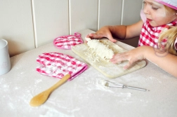 Rózsaszín-fehér kockás kesztyűk és alátét védik a kis kezeket a forró felületektől, ezzel biztonságossá téve a főzést.