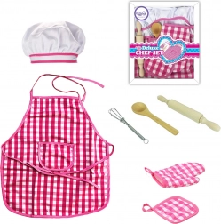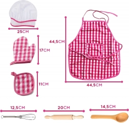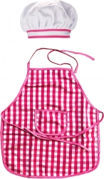 Rózsaszín-fehér kockás kötény és sapka, amelyek biztosítják a stílusos és funkcionális játékmenetet a gyerekek számára.