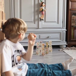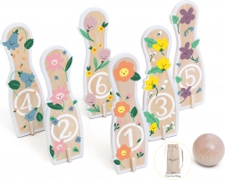Kedvelt gyerekjáték bowling stílusban, szép, természetes kivitelben. A bábuk minőségi fából készülnek, vidám virágokkal és számokkal díszítve, így a gyerekek játékosan gyakorolják a számolást és a vizuális észlelést. A kompakt szett a mellékelt zsákban könnyen hordozható – ideális otthonra és útra.