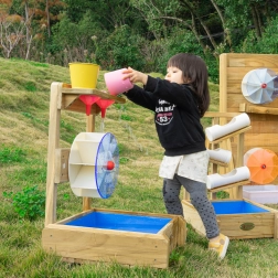 Ez a kültéri vizes játék természetes, impregnált fából készült, és tökéletes kiegészítője bármely homokozónak és kertnek. A gyerekek megismerik a víz áramlásának és az ok–okozatnak az elvét, miközben a forgó kerék és a vályúkon átfolyó víz örömteli felfedezést nyújt.