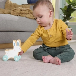 Ez a bájos, kerekeken guruló nyuszi aktív játékra ösztönzi a legkisebbeket – az első érintésektől és az ülve történő tologatástól kezdve egészen a kúszásig és a játék üldözéséig a padlón. Kompakt formája kiválóan illik a kis kezekbe, a sima gurulás pedig támogatja a mozgáskoordinációt és a természetes kíváncsiságot.