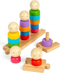 Ez a fa rakosgató készlet játékos felfedezést kínál a gyerekeknek. Az öt különálló pálca a puzzle talpon lehetővé teszi különféle figurák építését színes gyűrűkből és arcokkal ellátott fejekből. A cserélhető elemeknek köszönhetően a gyerekek felfedezhetik a formákat, színeket és sorrendeket, miközben türelmet és logikus gondolkodást gyakorolnak.