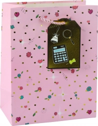 Az ajándéktáska egyedi és varázslatos megjelenésével az iskolai kellékek, mint például könyvek vagy számológép, díszként szolgálnak rajta.