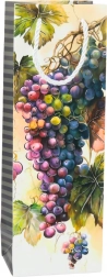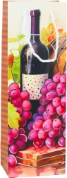 Színes motívumok boros palackokkal és szőlőfürtökkel elegáns megjelenést kölcsönöznek a zacskónak.