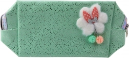 Ez az univerzális neszesszer a finom mentazöld színben játékos dizájnt ötvöz praktikus részletekkel. A csillogó szemcsék elegáns csavart adnak, míg az elülső bolyhos masnis felhő és a színes pomponok kiemelik a cuki stílust.