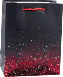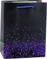 Elérhető négy színváltozatban: sárga, lila, piros és türkiz. Minden szín fekete háttérrel egészül ki, amely kiemeli az eleganciát és a kontrasztot a csillogó hatással. Erős zsinóros pántok, amelyek színben harmonizálnak a színátmenettel, biztosítják a kényelmes szállítást, és a stabil konstrukció garantálja a biztonságos tárolást még nehezebb ajándékok esetén is.