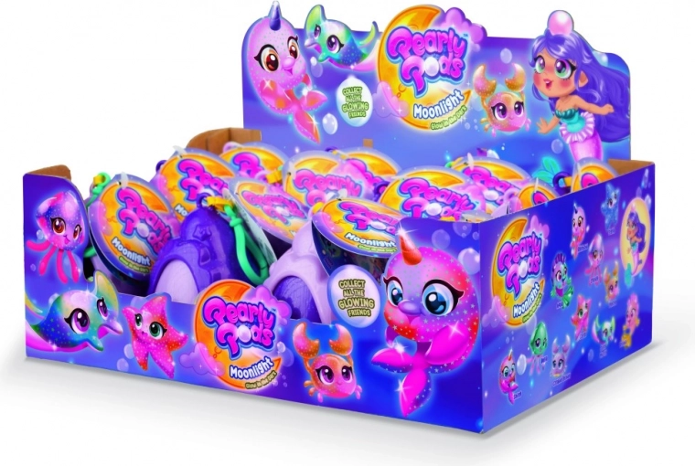 A Pearly Pods Moonlight világító barátok pihe-puha plüss figurák bájos színekben, látványos, fényes tokban. Elég őket fényben „feltölteni”, és sötétben lágy fénnyel derengenek, biztonságérzetet adva a gyerekeknek, a szobát pedig varázslatos hellyé változtatva.