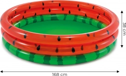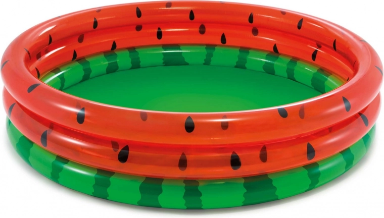 Nyári szórakozás a kertben a legkisebbeknek! Kerek, görögdinnye mintás felfújható medence a INTEX márkától, tágas játéktérrel (168 × 38 cm), tartós PVC falakkal 3 gyűrűből és 581 l kapacitással. Ideális 2 éves kortól, könnyű telepítéssel és figyelemfelkeltő dizájnnal a végtelen vízi mókához.