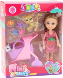 A készletben található mini babának hosszú, szőke haja van, amely fonatokba van kötve, rózsaszín csíkos ruhát és rózsaszín cipőt visel. A készlet tartalmaz egy rózsaszín-lila babakocsit, amely a két aranyos kiscica, egy fehér és egy barna szállítására szolgál. A készletet állati kiegészítők egészítik ki, mint például kalap, sapka és két korona, amelyek lehetővé teszik a gyermeknek különféle jelenetek létrehozását és képzelőerejük fejlesztését.
