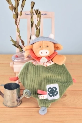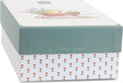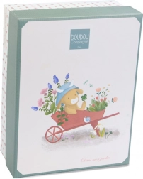 A boricsek zöld kordbársony ruhát visel virágos gallérral, amely játékra csábít, és megnyugvásra is szolgál. Elegáns ajándékdobozban érkezik, amely emlékek, mint a fényképek és egyéb újszülött emlékek megőrzésére is alkalmas. Az ajándékdoboz két rövid történetet is tartalmaz örömszerzés céljából.