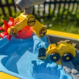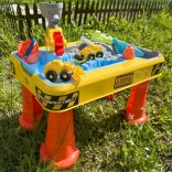 A nagy, építkezés témájú asztali szett órákon át tartó érzékszervi és kreatív játékot kínál. A dupla rekesznek köszönhetően az egyik rész vízzel, a másik homokkal tölthető meg, így a kis építők kipróbálhatják az ásást, szórást, öntést és a járművek irányítását. A stabil „kúpos” lábaknak hála az asztal masszív és biztonságos kültéri és beltéri használatra egyaránt.