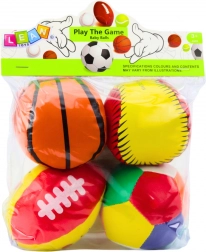 Puha sportos labdák ideálisak kisgyermekek számára - biztonságosak, színesek és támogatják a mozgási aktivitást. Ez a készlet négy különböző labdát tartalmaz, amelyek a klasszikus sportjátékokat utánozzák.