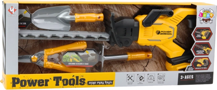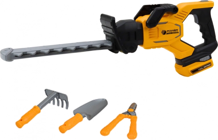 A gyermek kerti készlet valósághű játékverziót tartalmaz az elektromos sövényvágó ollókból, mozgatható műanyag pengékkel. Elég megnyomni a gombot, és megkezdhetik a biztonságos „vágást”! Az ollón ergonomikus fogantyú, levehető akkumulátormodul és olyan elemek találhatók, amelyek a valódi kerti szerszámok működését utánozzák. A készlet részei még kézi eszközök: gereblye, lapát és metszőolló.