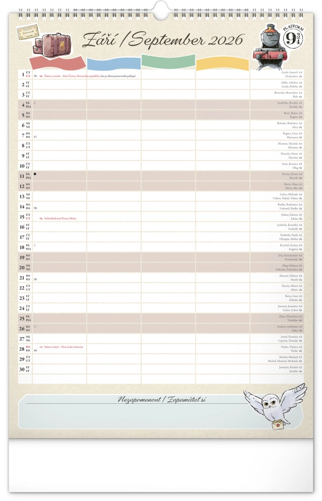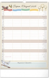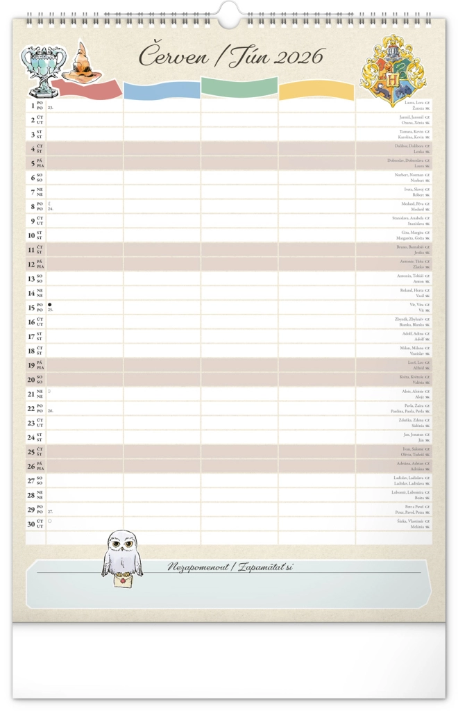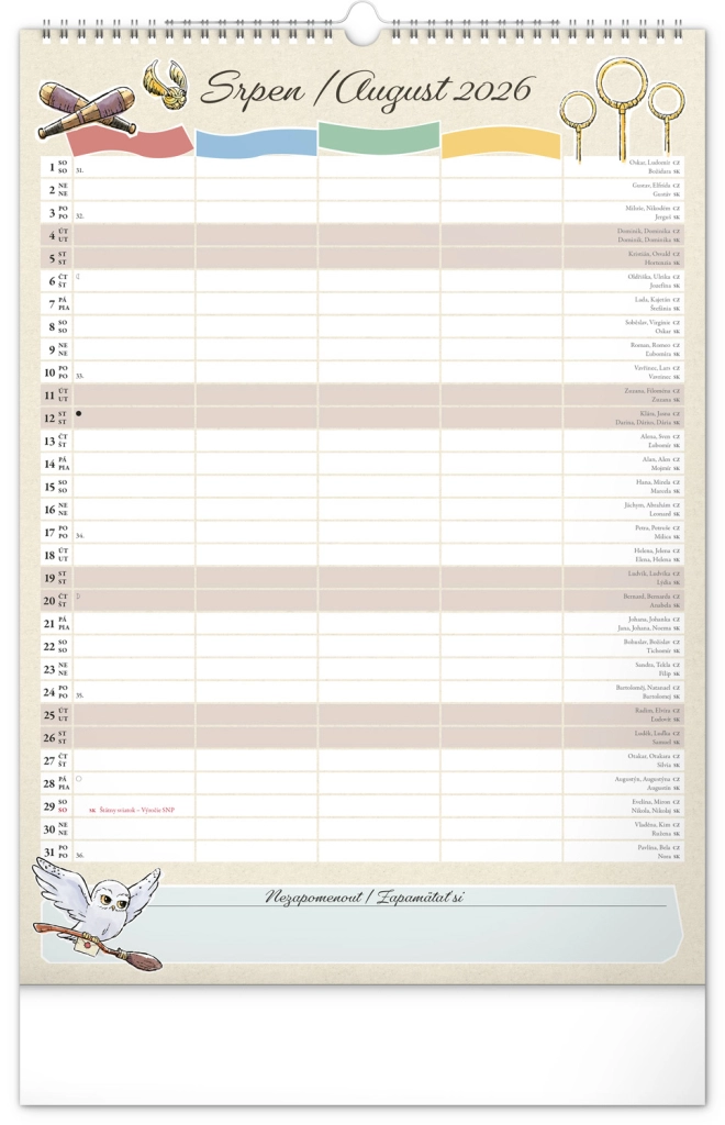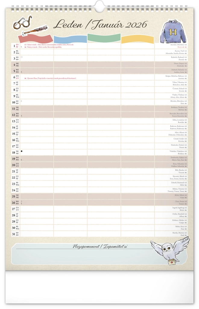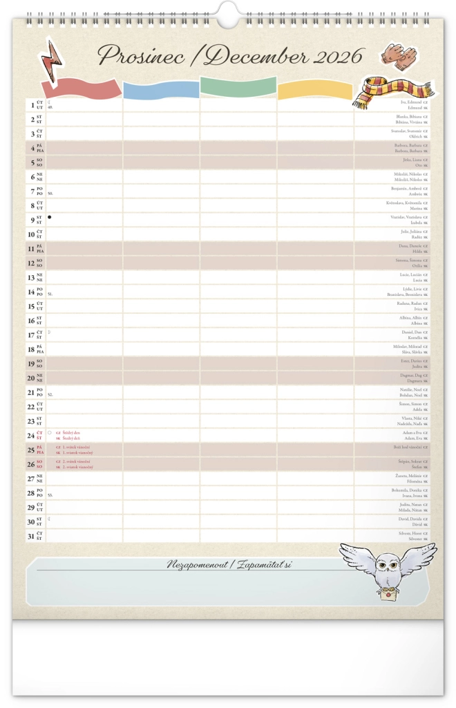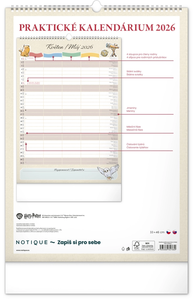Bemutatjuk a Harry Potter világának varázsát az otthonába hozó családi tervező falinaptárt. Minden hónapban örömét lelheti szeretett hőseinek és a varázsvilág helyszíneinek képeiben és motívumaiban. Ez a naptár nem feledkezik meg a cseh és szlovák kalendáriumról, tartalmazza a állami ünnepeket és a holdfázisokat, és ideális segítség muglik és varázslók tevékenységeinek szervezéséhez.