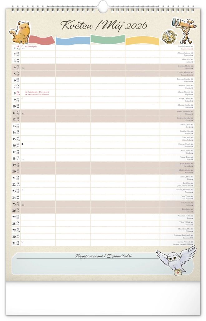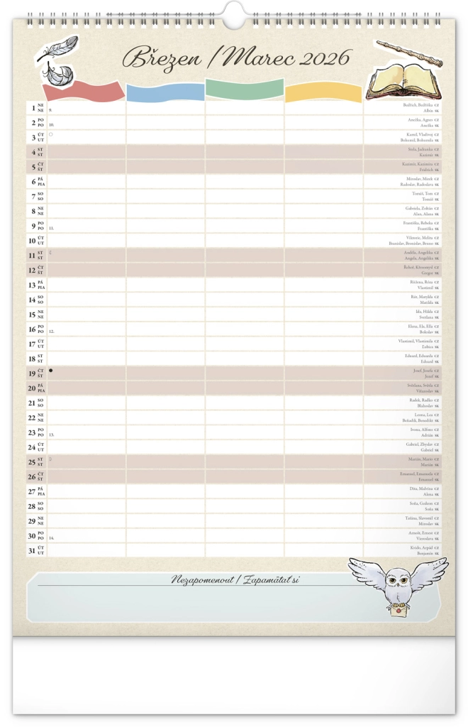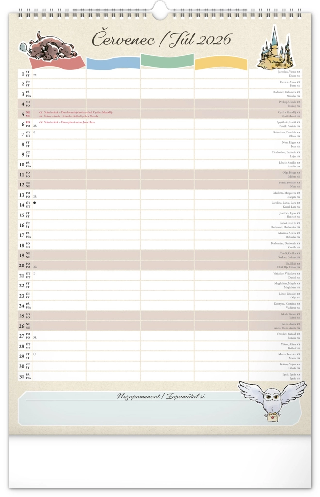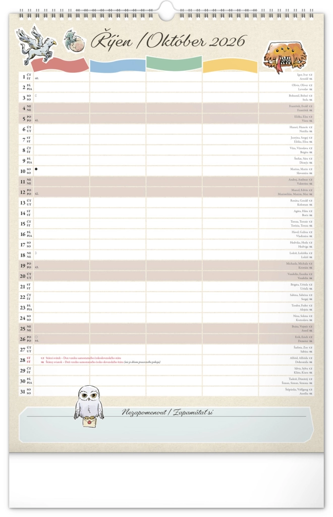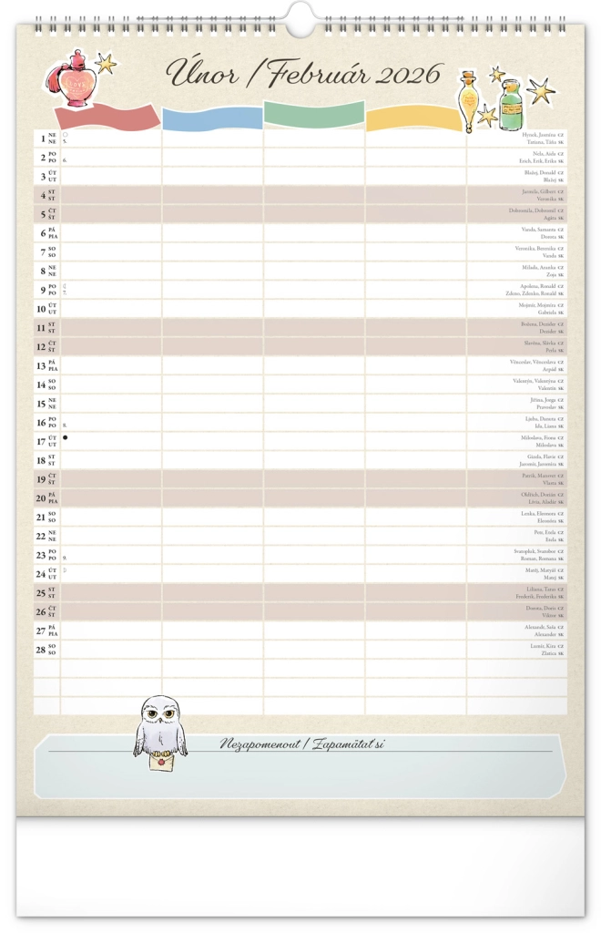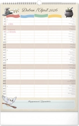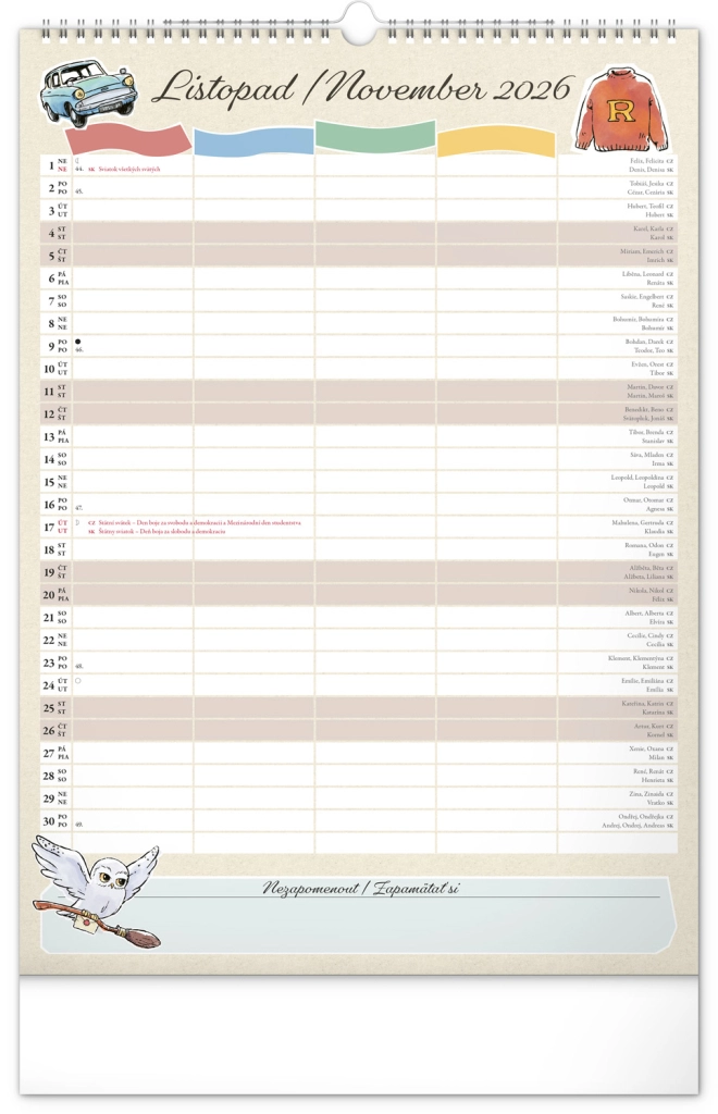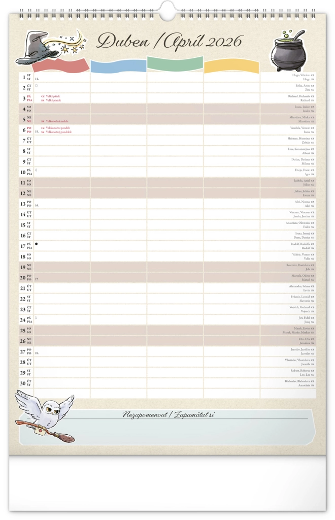 Bemutatjuk a Harry Potter világának varázsát az otthonába hozó családi tervező falinaptárt. Minden hónapban örömét lelheti szeretett hőseinek és a varázsvilág helyszíneinek képeiben és motívumaiban. Ez a naptár nem feledkezik meg a cseh és szlovák kalendáriumról, tartalmazza a állami ünnepeket és a holdfázisokat, és ideális segítség muglik és varázslók tevékenységeinek szervezéséhez.
