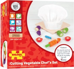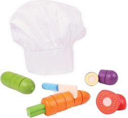 • Komplett szett – fa kés, zöldségek és textil szakácssapka.