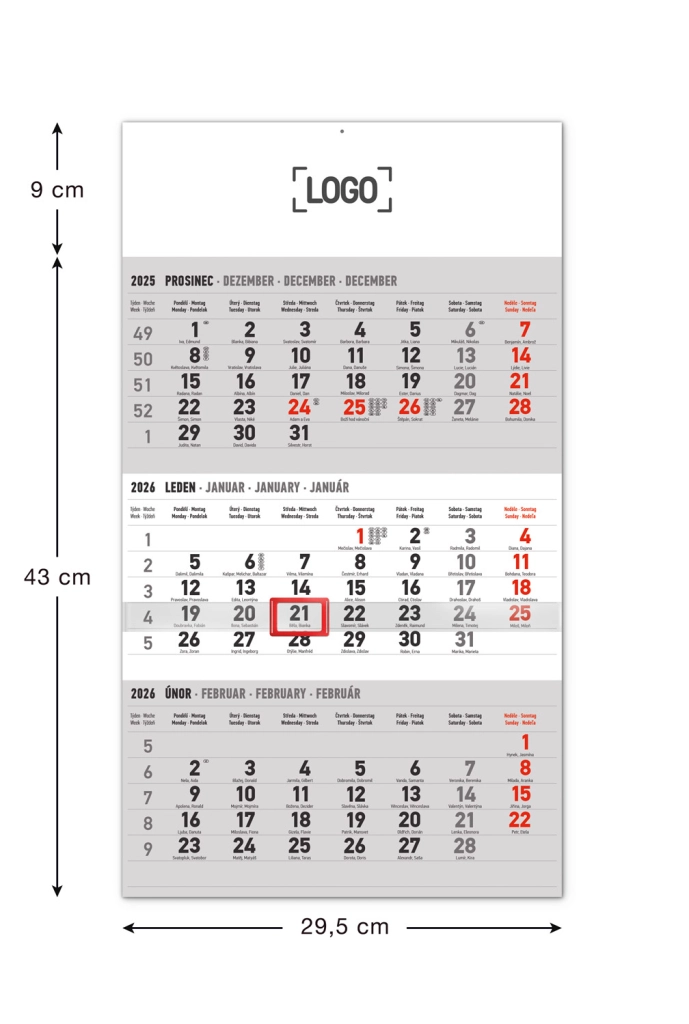 Tartsa kézben az egész 2026-os évet ezzel az elegáns fali naptárral. A háromhavi elrendezés egyszerre mutatja az előző, az aktuális és a következő hónapot, így a tervezés gyors és intuitív. A szürke háttér kiváló olvashatóságot biztosít, és professzionális hatást kelt irodában és otthon egyaránt.