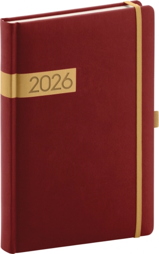 2026-os napi napló elegáns bordó-arany kombinációban, tökéletes segítség napjaid precíz szervezéséhez. A felületek egyedülálló kombinációjának köszönhetően nemcsak stílust kínál, hanem maximális funkcionalitást is.