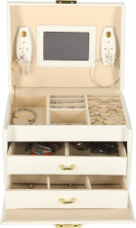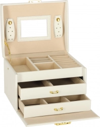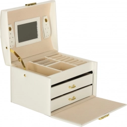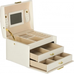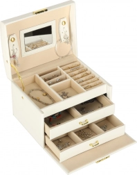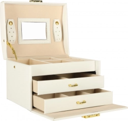 Elegáns és tágas ékszerdoboz tükörrel, amely rendezetten és biztonságban tartja a gyűrűket, fülbevalókat, karkötőket és láncokat. Puha, bársonyos belső kárpitja, két fiókja, gyűrűtartó szervezője és praktikus kulcsra zárható zárszerkezete aranyszínű fém kiegészítőkkel rendelkezik. Ideális mindennapi használatra és stílusos kiegészítőként a toalettasztalon.