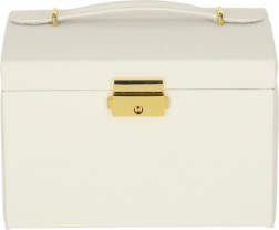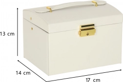Tartós kivitel, fehér szín arany részletekkel és kulccsal zárható megoldás a biztonságos tárolásért otthon és utazás közben is. Az ékszerdoboz könnyű, helytakarékos, mégis elég tágas egy nagyobb kollekció számára.