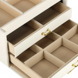 Az alsó, puha bélelésű fiókok ideálisak karkötők, láncok és nagyobb kiegészítők számára. A kihúzás könnyű az aranyszínű fogantyúknak köszönhetően.