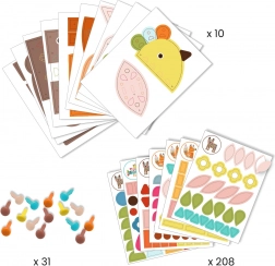 DJECO kreatív készlet, amely 3 éves kortól ajánlott gyermekeknek, több mint 200 nagy matricát tartalmaz. Rakd össze a medvét, a rókát és a madarat összekötő elemek segítségével.