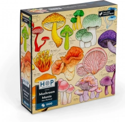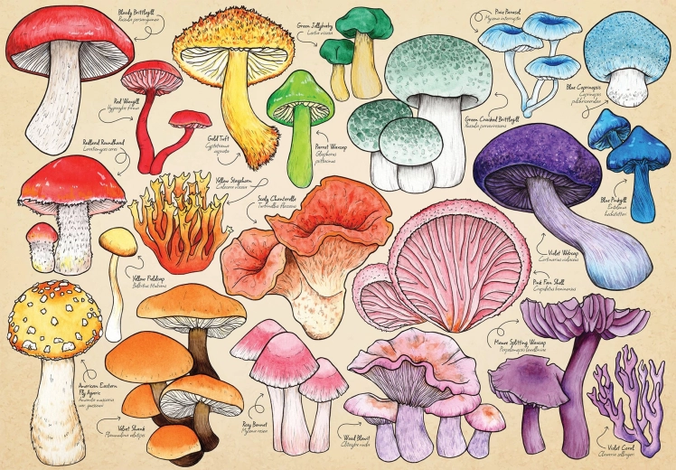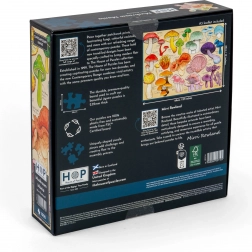 A gombák angol és latin nyelvű nevei révén a kirakós oktatási elemet is hoz. A kész kép mérete körülbelül 69 x 48 cm.