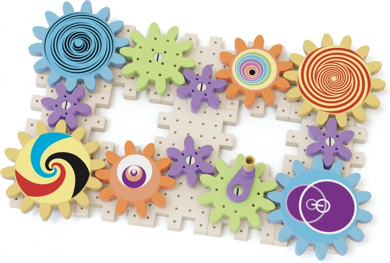 A Kaleidoszkópikus fogaskerekek építőkészlet lehetőséget ad a gyerekeknek arra, hogy egy látványos láncot hozzanak létre különböző méretű fogaskerekekkel, amelyek úgy forognak, mint egy körhinta. Összesen 38 részre oszlik, melyek közé perforált lemezek, pálcikák és színes nyomtatott matricák tartoznak. A gyermekek játék közben elsajátítják a mechanika alapvető elveit és felfedezik az optikai hatásokat, amelyek valóban varázslatosak.