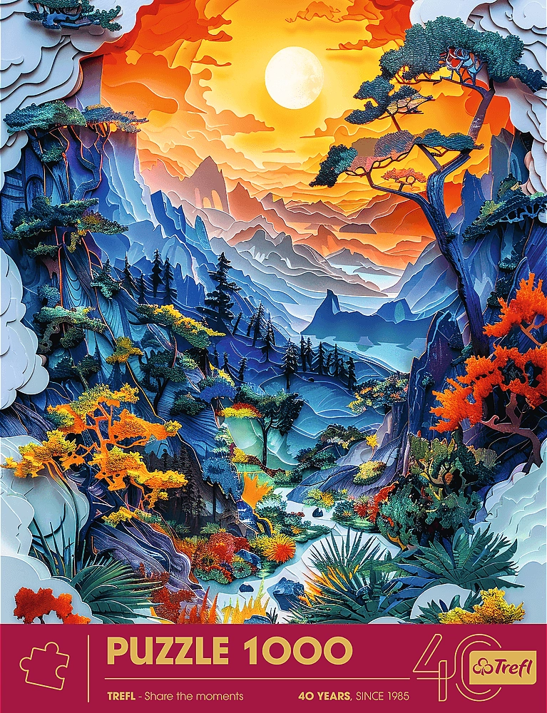 Fedezze fel a kreatív kirakás szépségét a Trefl Papírművészet: Völgy puzzle segítségével. Az 1000 darab nemcsak szórakozást, hanem lenyűgöző vizuális élményt is kínál.