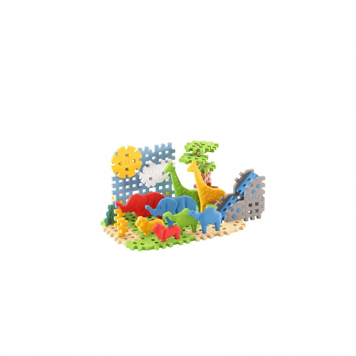 A Mini Waffle - Szavanna Állatok építőjátékkal a gyerekek saját fantáziavilágot hozhatnak létre, tele afrikai élettel. Tartalmaz 50 különböző alakú darabot, amelyek lehetővé teszik látványos elemek, mint például festői vízesés és a szavanna lenyűgöző hátterének megalkotását. Része a napsütötte oroszláncsalád, ivóhelyen tartózkodó elefántok és a távolban legelésző zsiráfok is.