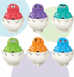Woopie márkájú játéktojások bevezetik gyermekét a színek, formák és vidám arcok világába. Mind a hat aranyos tojás egy színes csibét rejt vicces arckifejezéssel, amely megnyomva hangeffektust ad ki. A cél nemcsak a megfelelő héj összerakása, hanem annak elhelyezése is a megfelelő helyre a tartóban.