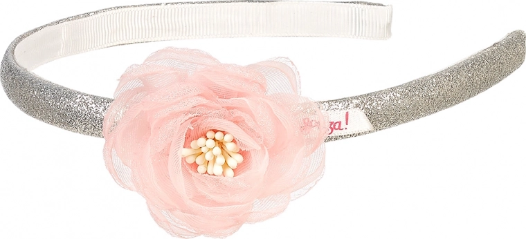 Csillogó ezüst hajpánt kis hercegnőknek 3 éves kortól, gyönyörű rózsaszín tüll virággal díszítve. Könnyen és kényelmesen ül a fejen, nyomás nélkül.
