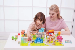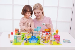 A készlettel a gyerekek tipikus városi épületeket építhetnek, mint például iskola, rendőrörs, tűzoltóság, repülőtér, kórház, bank, étterem, állatkereskedés és további épületek. A játék természetes, biológiailag lebomló és hipoallergén anyagokból készült, ami maximális biztonságot nyújt.