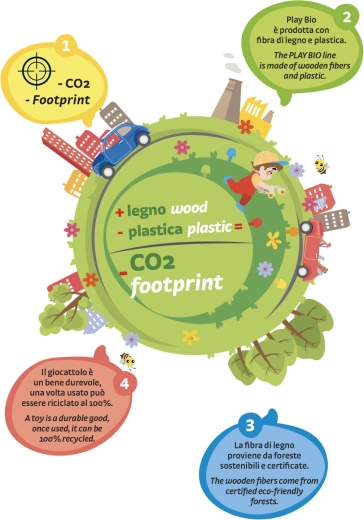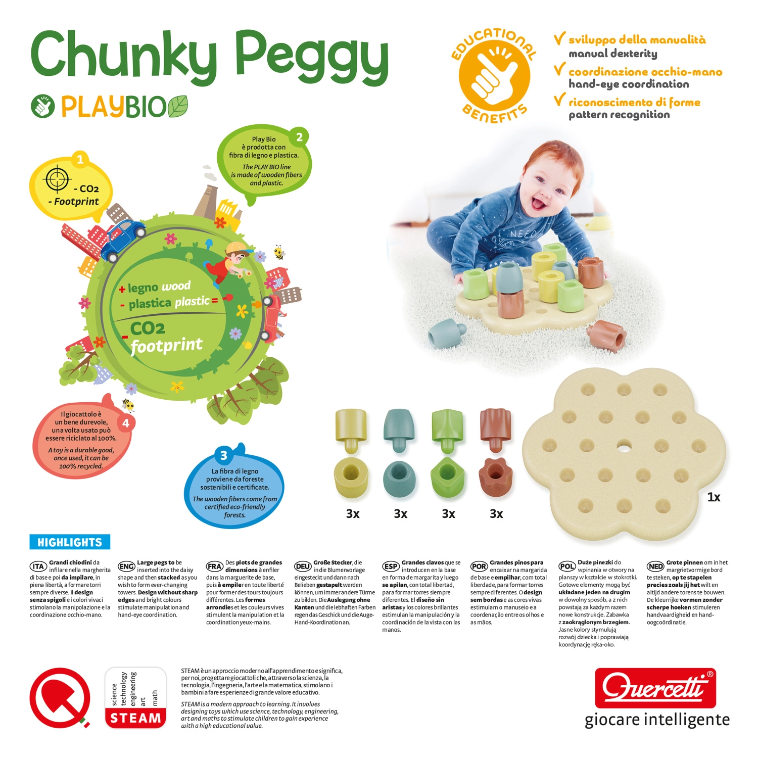 A PlayBio - Chunky Peggy játék ideális kisgyermekek számára, köszönhetően színes építőelemeinek és biztonságos kialakításának. Biokompozit anyagból készült, amely segít a CO2-kibocsátás csökkentésében.