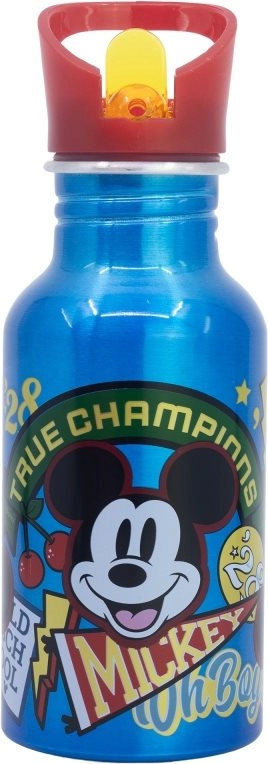 Tartós alumínium ivópalack MICKEY MOUSE mintával, 545 ml űrtartalommal, gyerekeknek és felnőtteknek. Csavaros kupakot, kiömlést gátló szívószálat, praktikus hordfület kínál, és BPA-mentes.
