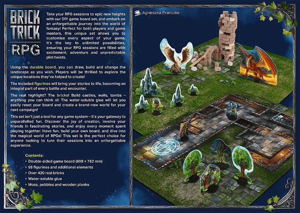 Fedezze fel a Trefl Brick Trick RPG: elfeledett örökség készletet, amely ötvözi az RPG kalandokat a valódi téglákkal és a vízben oldódó ragasztóval, így újra és újra építhet. Készítsen várakat, romokat, börtönöket és más környezeteket látványos játékszcenáriókhoz, fejlessze a kreativitást, a taktikai gondolkodást, és teremtsen felejthetetlen díszleteket minden RPG kampányhoz.