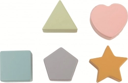 Öt, élénk színű bedobós forma segíti a gyerekeket a formák és színek felismerésében, valamint a fogás pontosságának és a térbeli észlelésnek a gyakorlásában.